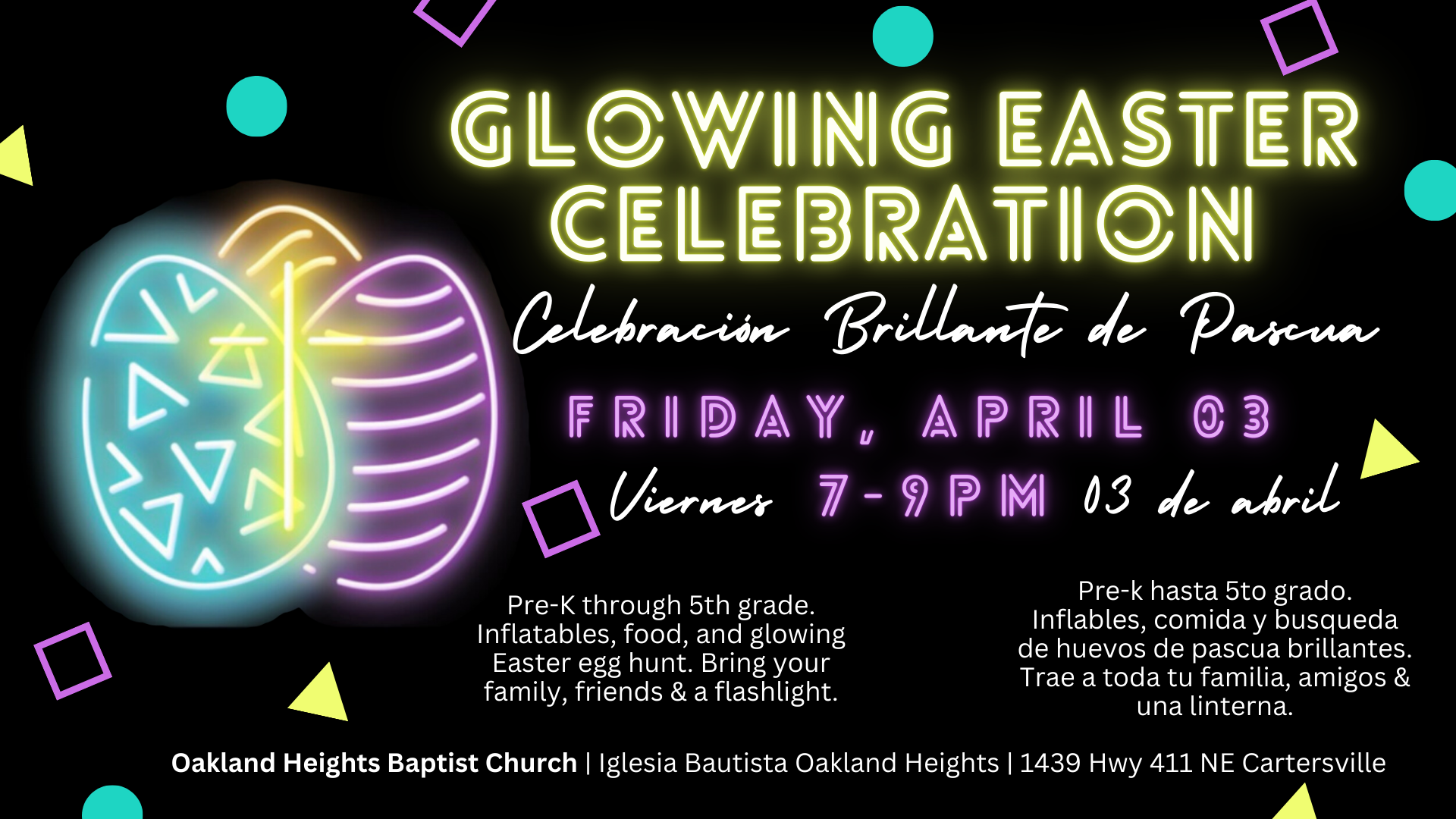 Pre-k hasta 5to grado. Inflables, comida y busqueda de huevos de pascua brillantes. Trae a toda tu familia, amigos & una linterna.